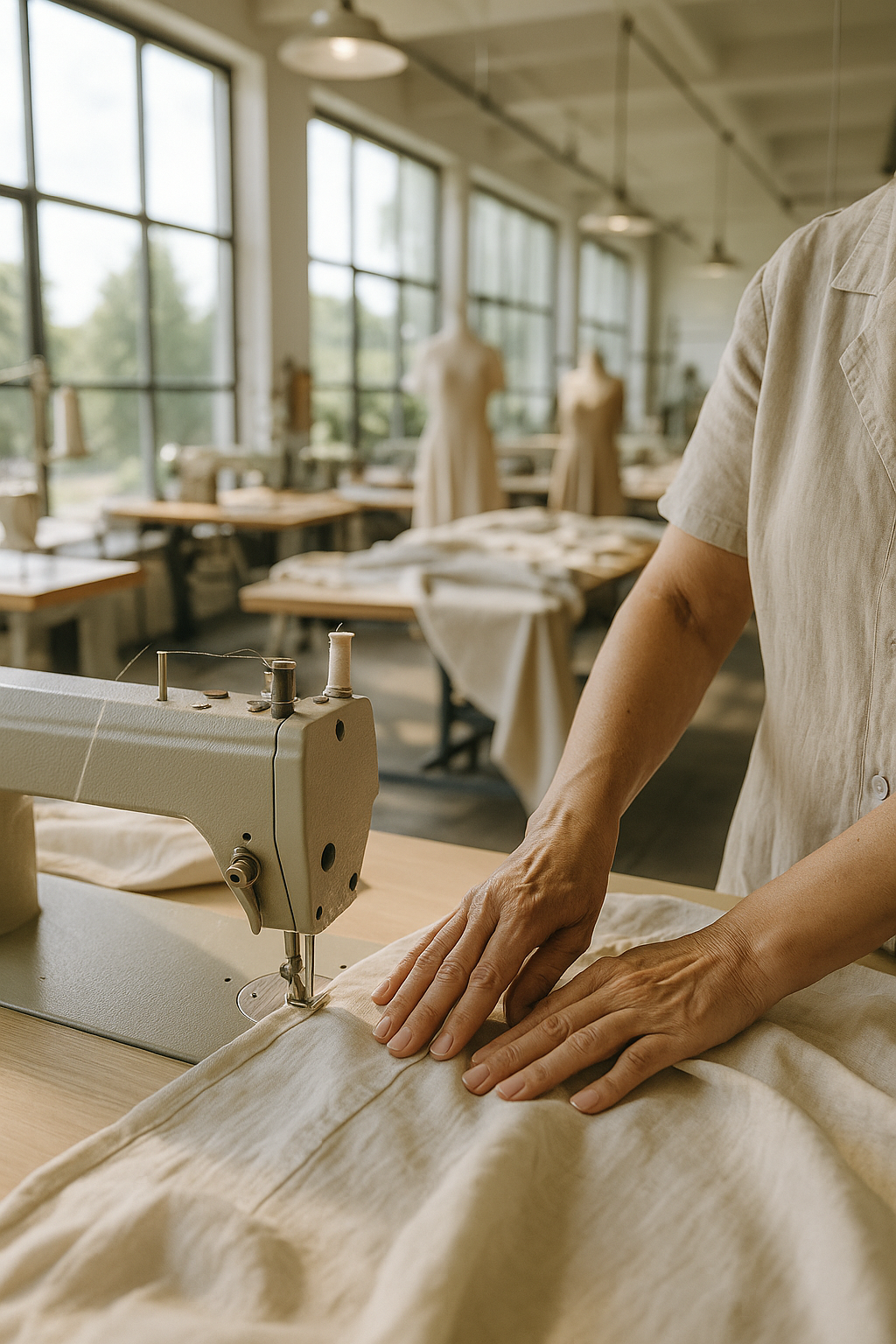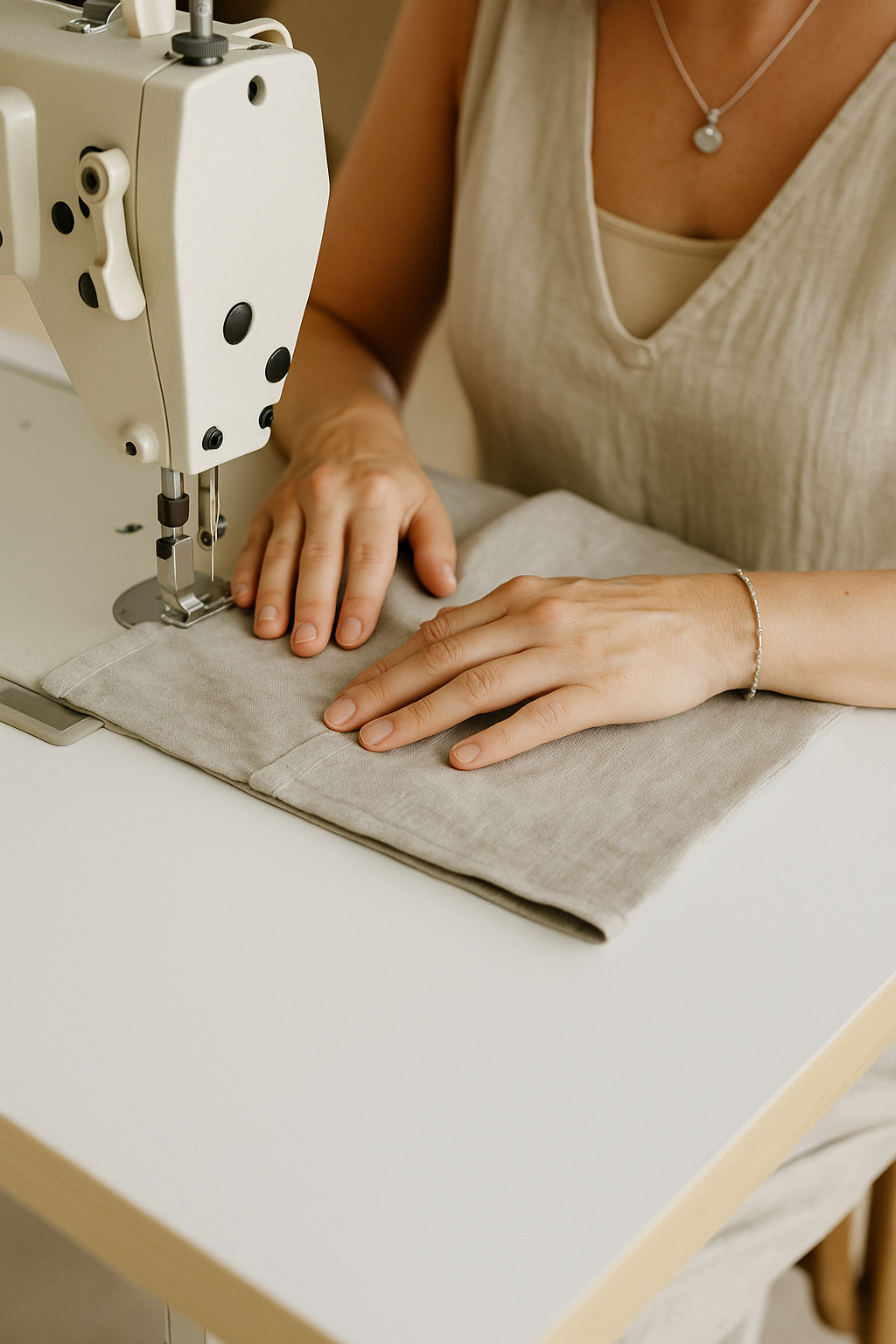 From cutting the pure linen to the final stitch – every step is done by hand, in small batches, to ensure the highest quality